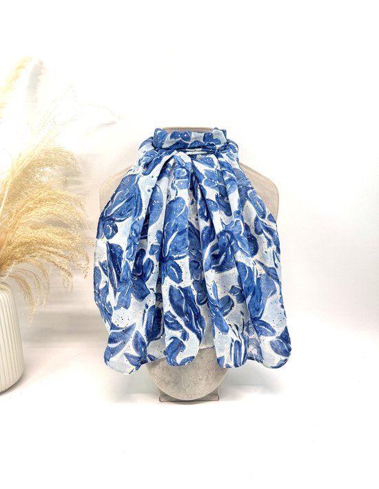 Lange dames sjaal Jolie in gebloemd motief in de kleuren blauw, wit, lichtblauw, koningsblauw royal blue en goud. Langwerpig model. De sjaal is gemaakt van 100% viscose. De sjaal kan gedragen worden in alle seizoenen van het jaar. Handwas. U kunt de sjaal combineren met diverse kledingstukken zoals een T-shirt, blouse, trui, sweater, tuniek, jurk, vest, blazer of jas. De lengte van de sjaal is 180 cm, de breedte van de sjaal is 87 cm.