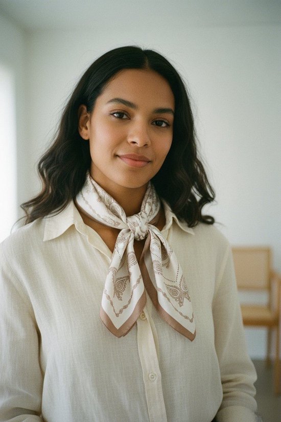 Vierkante dames sjaal Maartje in paisleymotief in de kleuren bruin en wit. Vierkant model. De neksjaal is gemaakt van 80% polyester en 20% zijde. Handwas. De lengte van de halssjaal is 70 cm lang en de breedte van de sjaal is 70 cm. Een leuke sjaal om te dragen met diverse kledingstukken zoals een T-shirt, blouse, trui, sweater, tuniek of jurk. Ook leuk als sjaal aan uw tas !