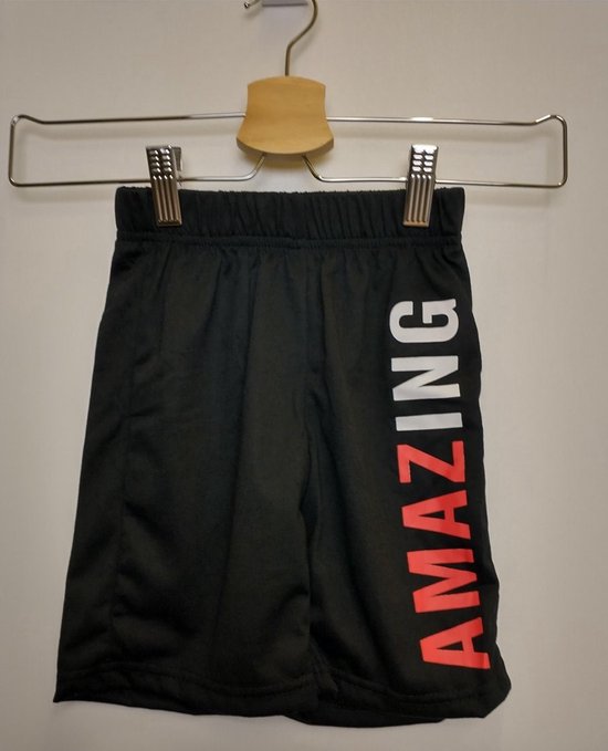 Jongens korte broek Amazing in de kleur zwart met letteropdruk Amazing in de kleur wit en rood. De bovenzijde van de broek heeft een elastische tailleband. De short is gemaakt van 100% polyester. De korte broek heeft geen zakken. Rekbare en zachte stof om te dragen. Lengte 35 cm/Breedte 23-28 cm. Rekbare wijdte. Wasbaar op 30 graden.