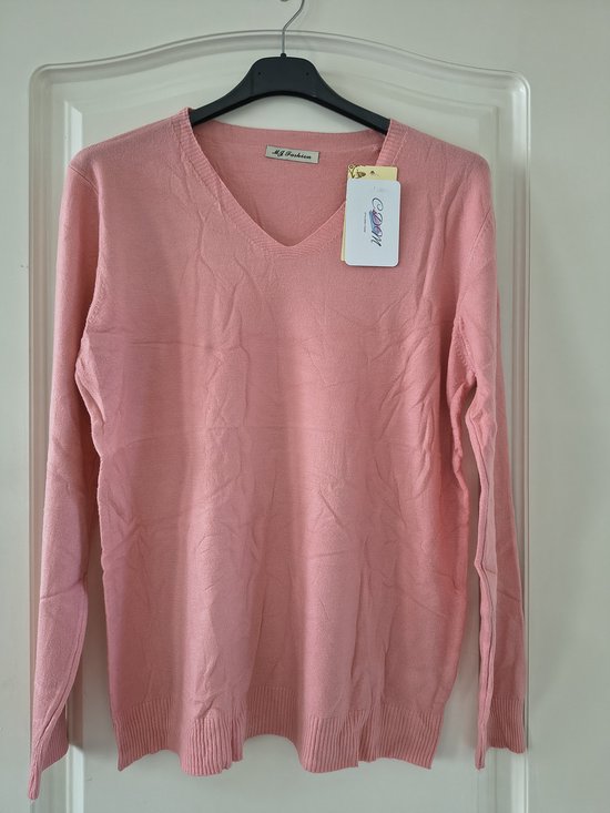 Dames warme trui Alida-V-hals-fijngebreid-effen roze-lange mouwen-maat XL/XXL