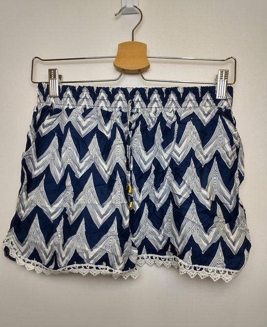 Dames short / Dames korte broek Roos in zigzagmotief in de kleuren blauw en wit. Met elastische bovenzijde en 2 steekzakken. Aantrekkoord aan de bovenzijde met 2 goudkleurige dopjes. De pijpen van de broek hebben een leuk wit kanten randje. De korte broek is gemaakt 95% viscose en 5% polyester. Fijne luchtige stof om te dragen tijdens de warme zomer dagen. Maat M/L. Lengte 35 cm/Breedte 33 cm-50 cm.